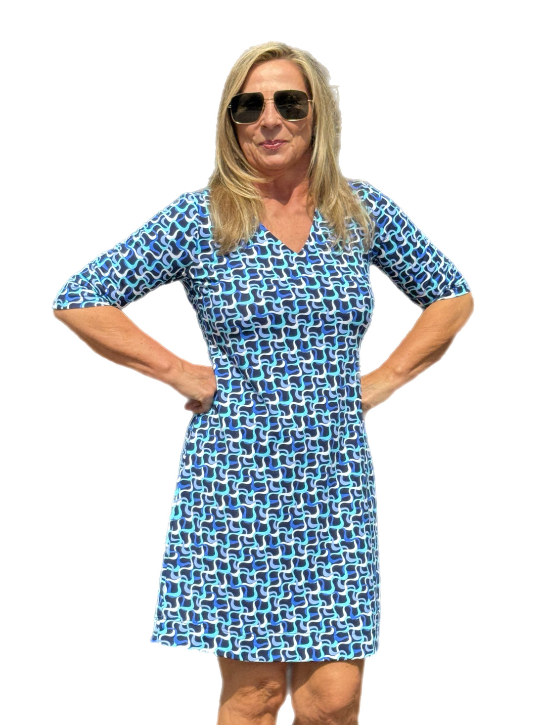 Elbow-Sleeve Travel Dress with UPF50+ Navy Waves