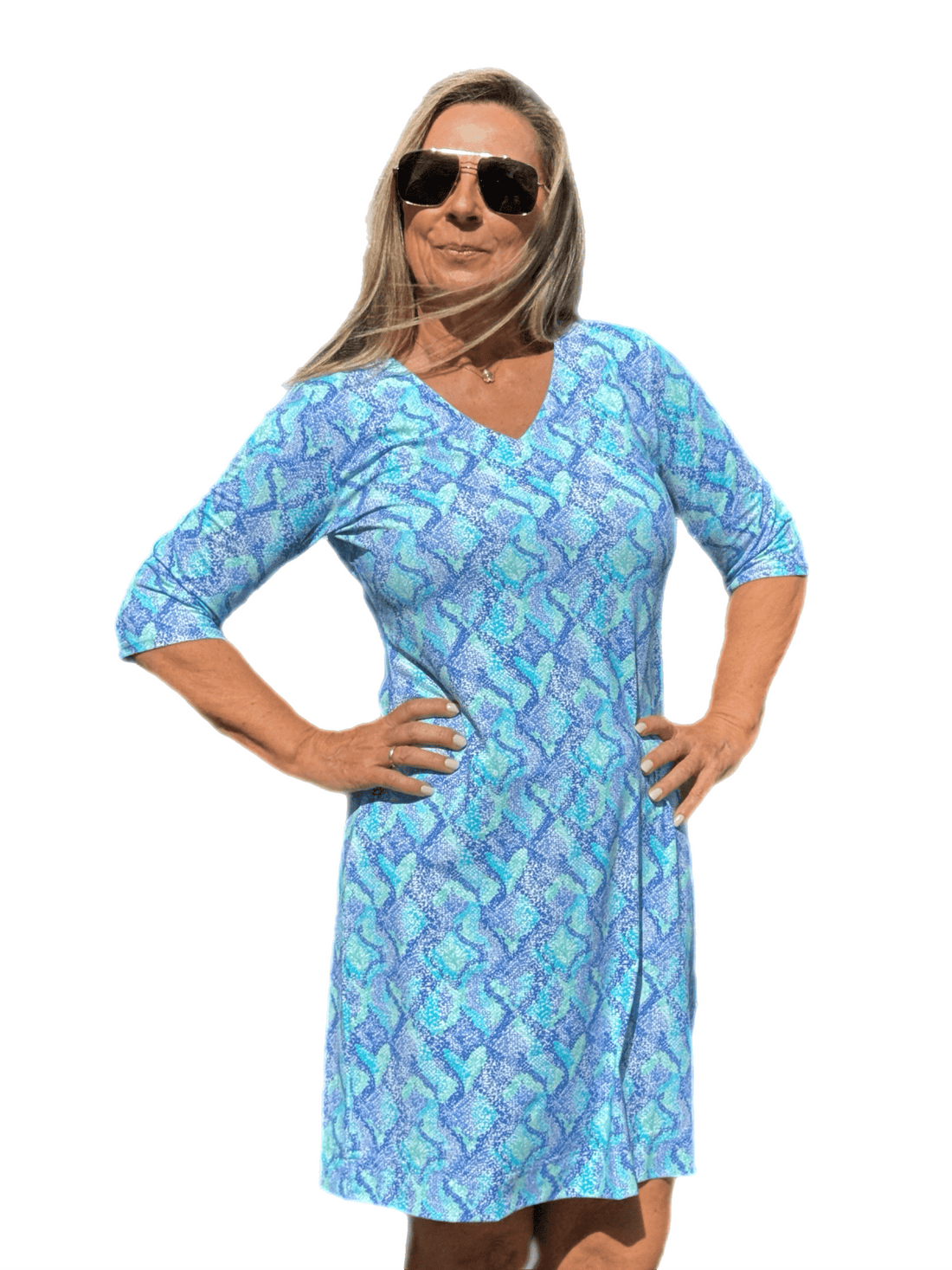Elbow-Sleeve Travel Dress with UPF50+ Seafoam Python
