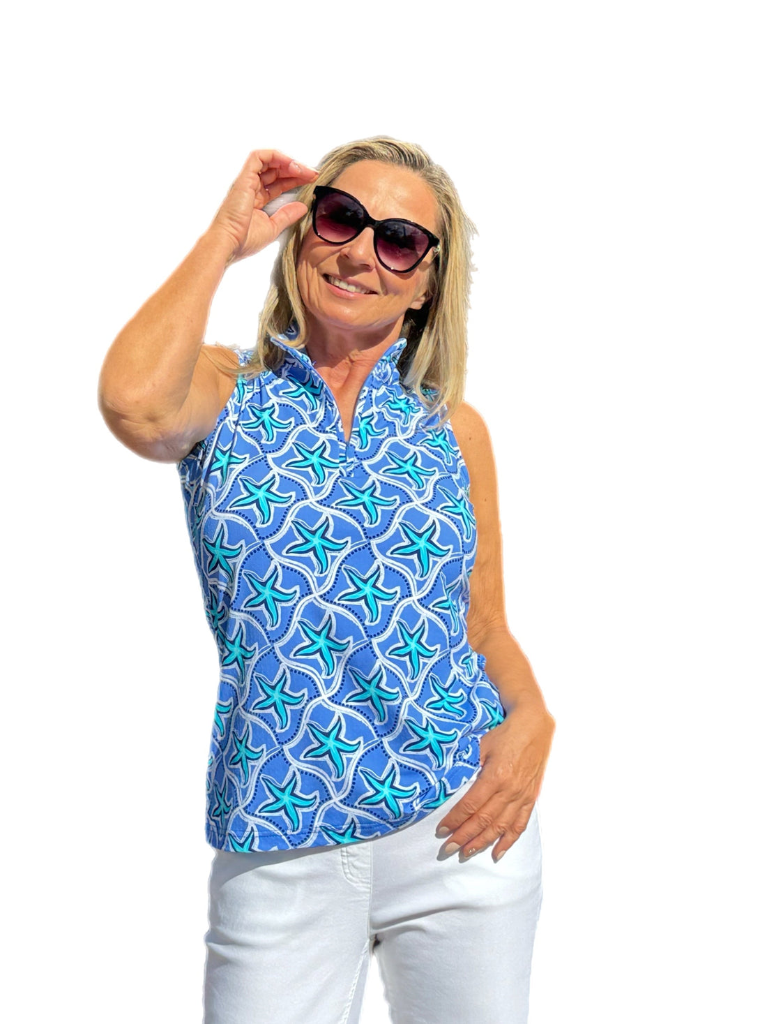 High Zip-Neck Sleeveless Top with UPF50+ Blue Starfish
