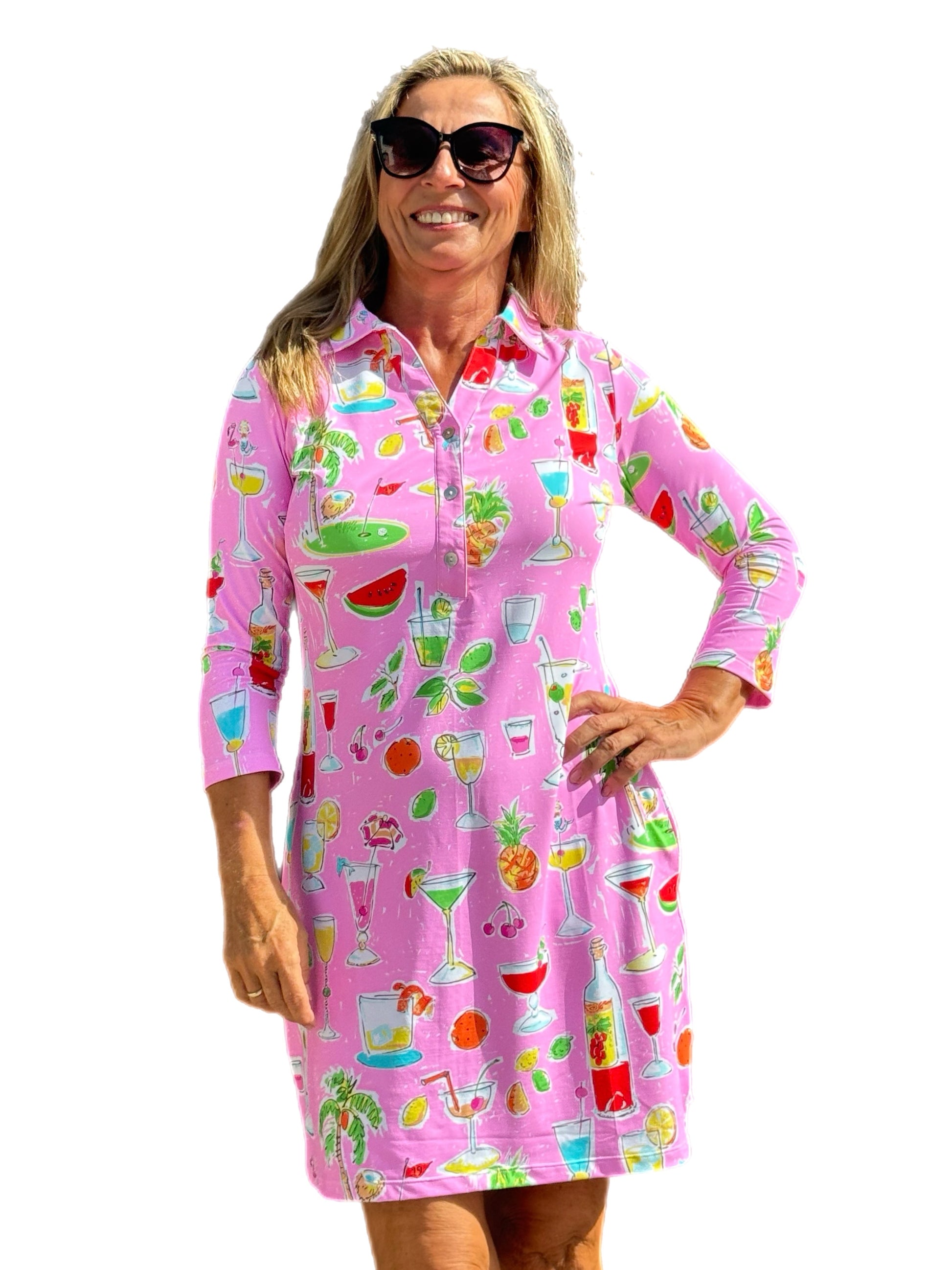 3/4 Sleeve Polo-Collar Dress with UPF50+ Pink Happy Hour