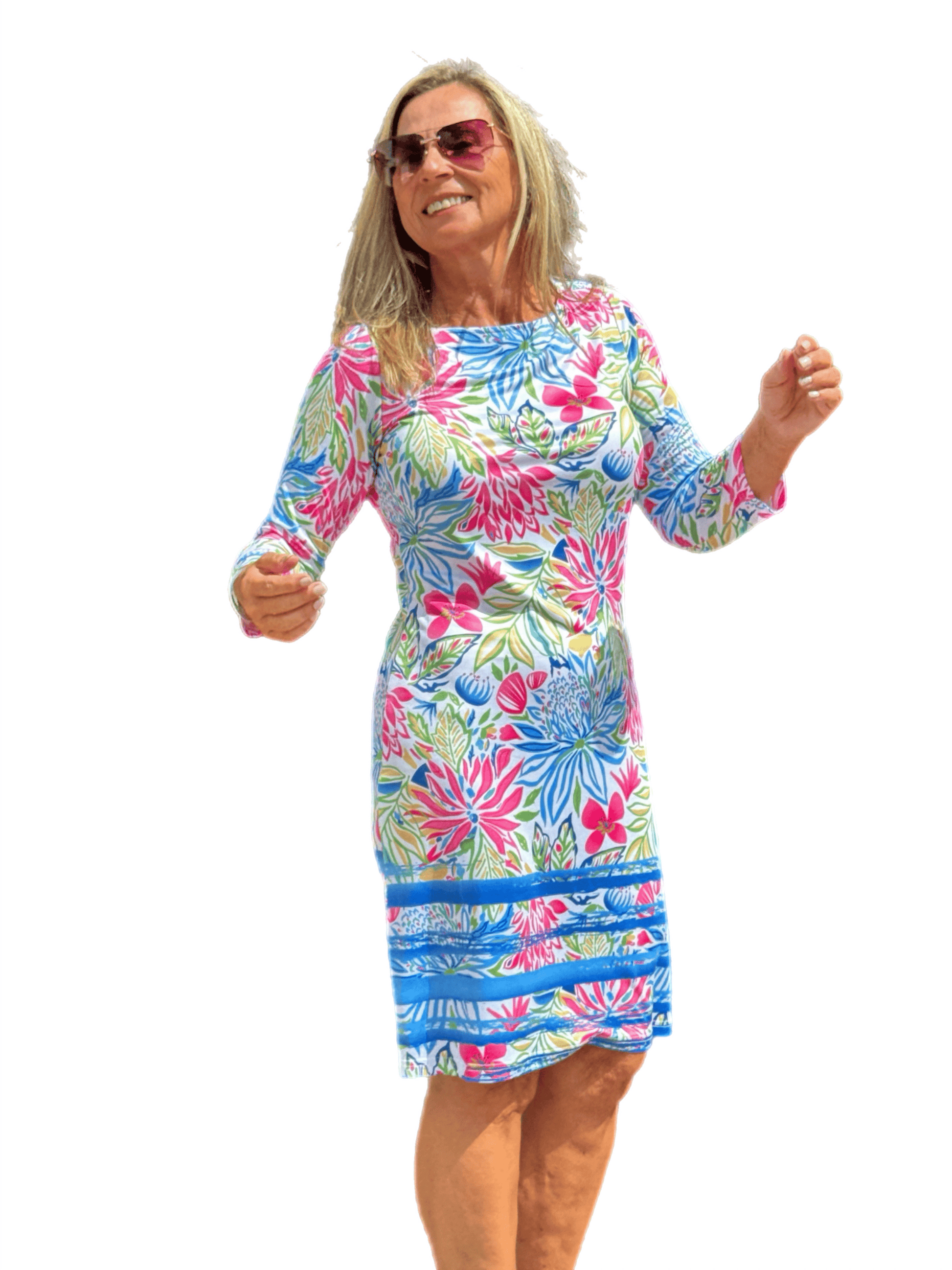 3/4-Sleeve Boat-Neck Dress with UPF50+ Summer Garden