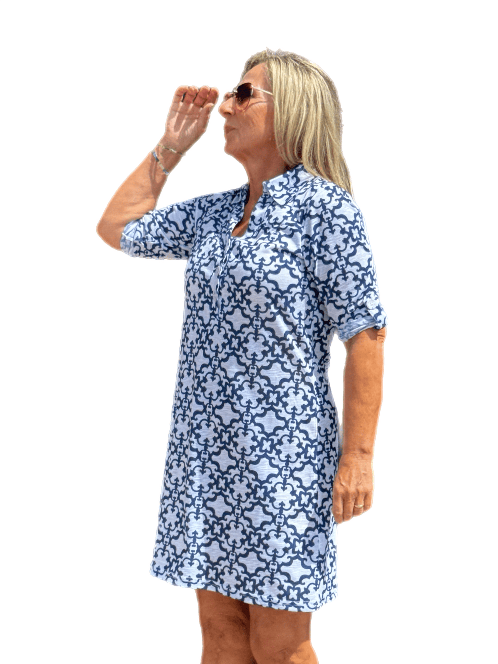 3/4-Sleeve Polo-Collar Dress White/Navy
