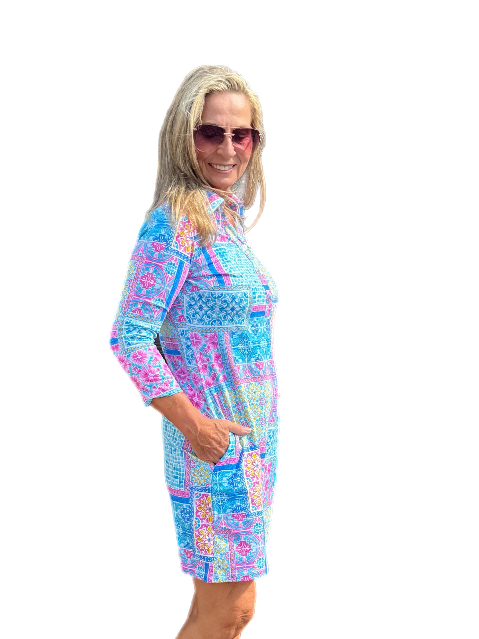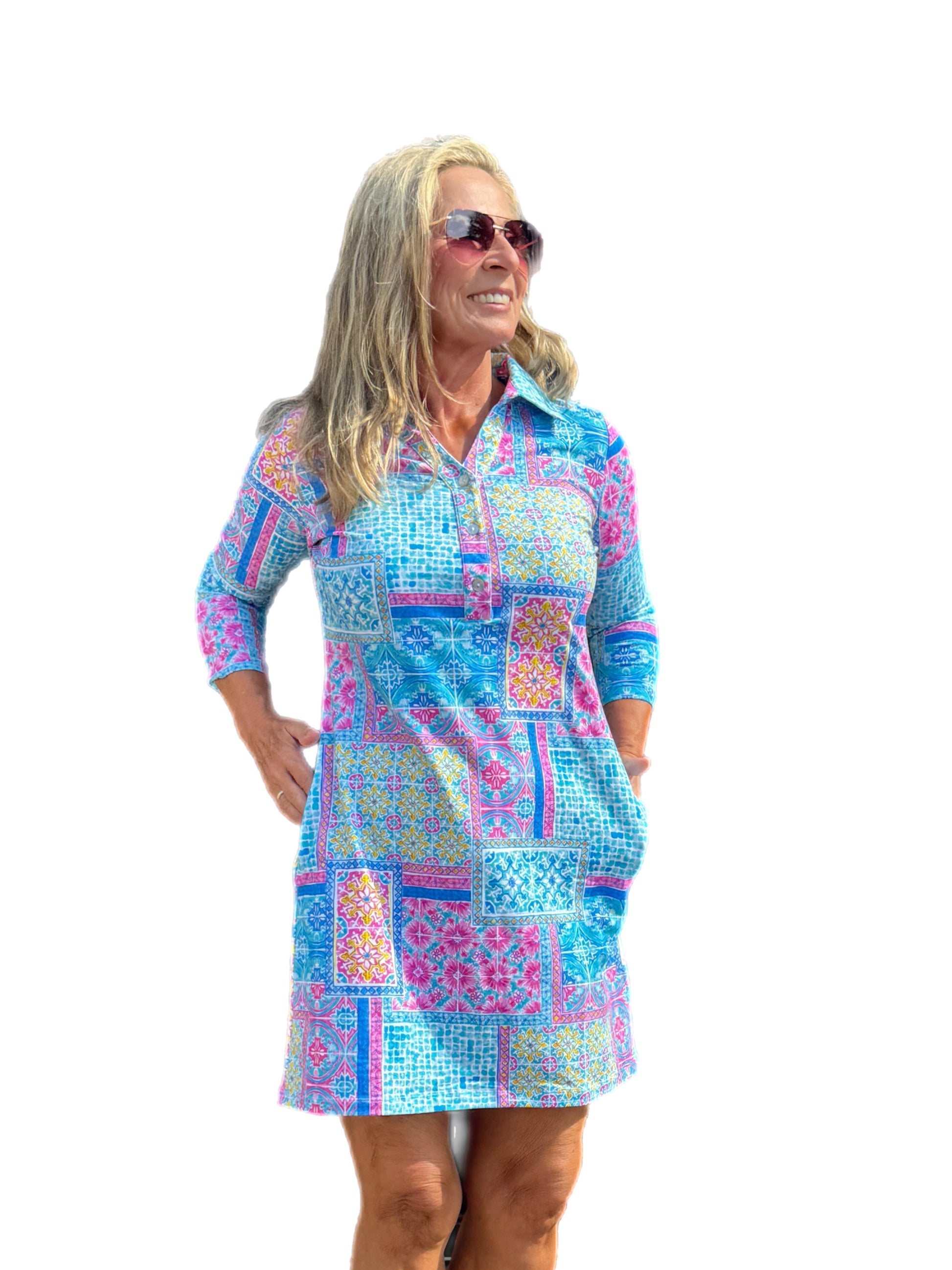 3/4 Sleeve V-Neck Polo COTTON Dress with UPF50+ Granada Seafoam/Pink