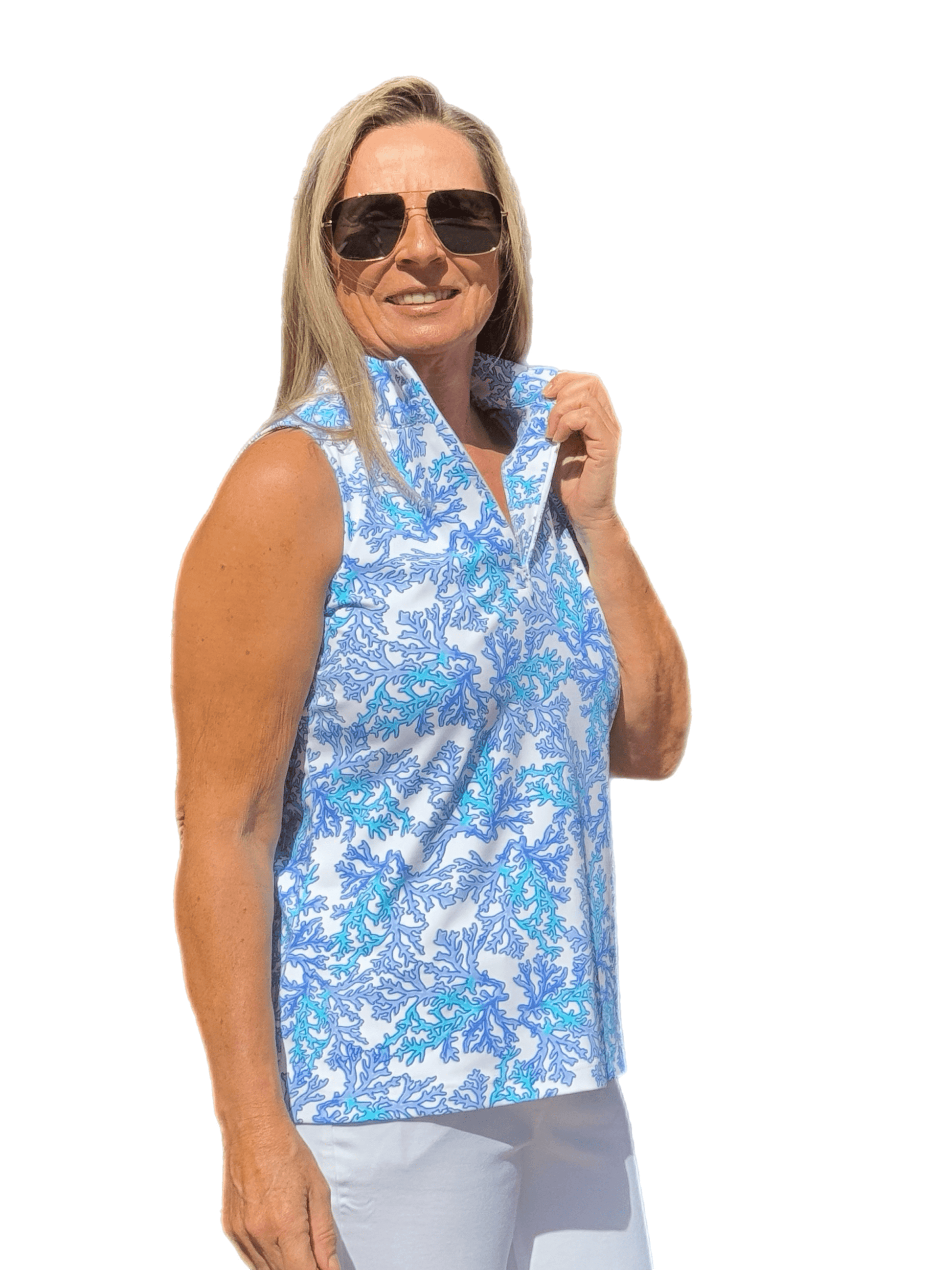 High Zip-Neck Sleeveless Top with UPF50+ Coral Blue